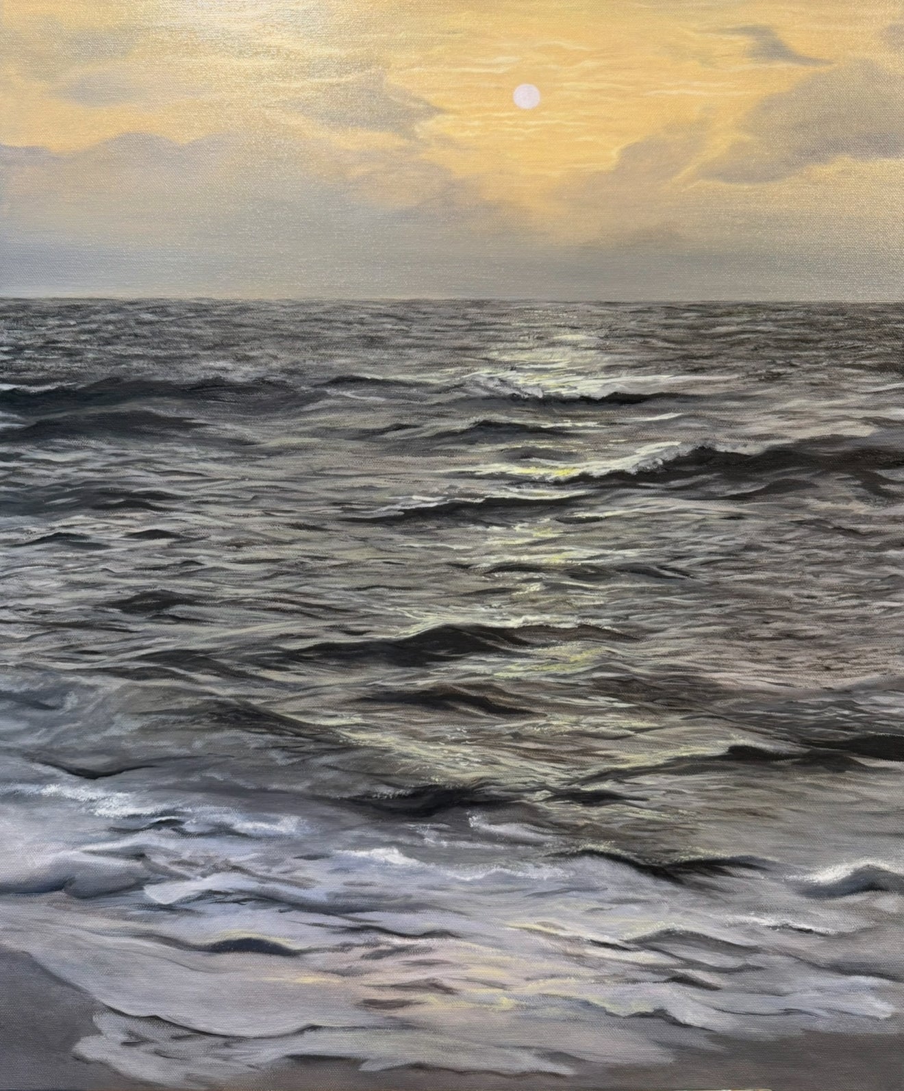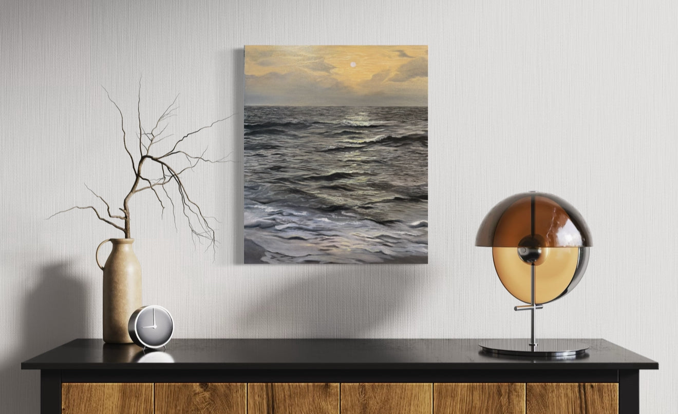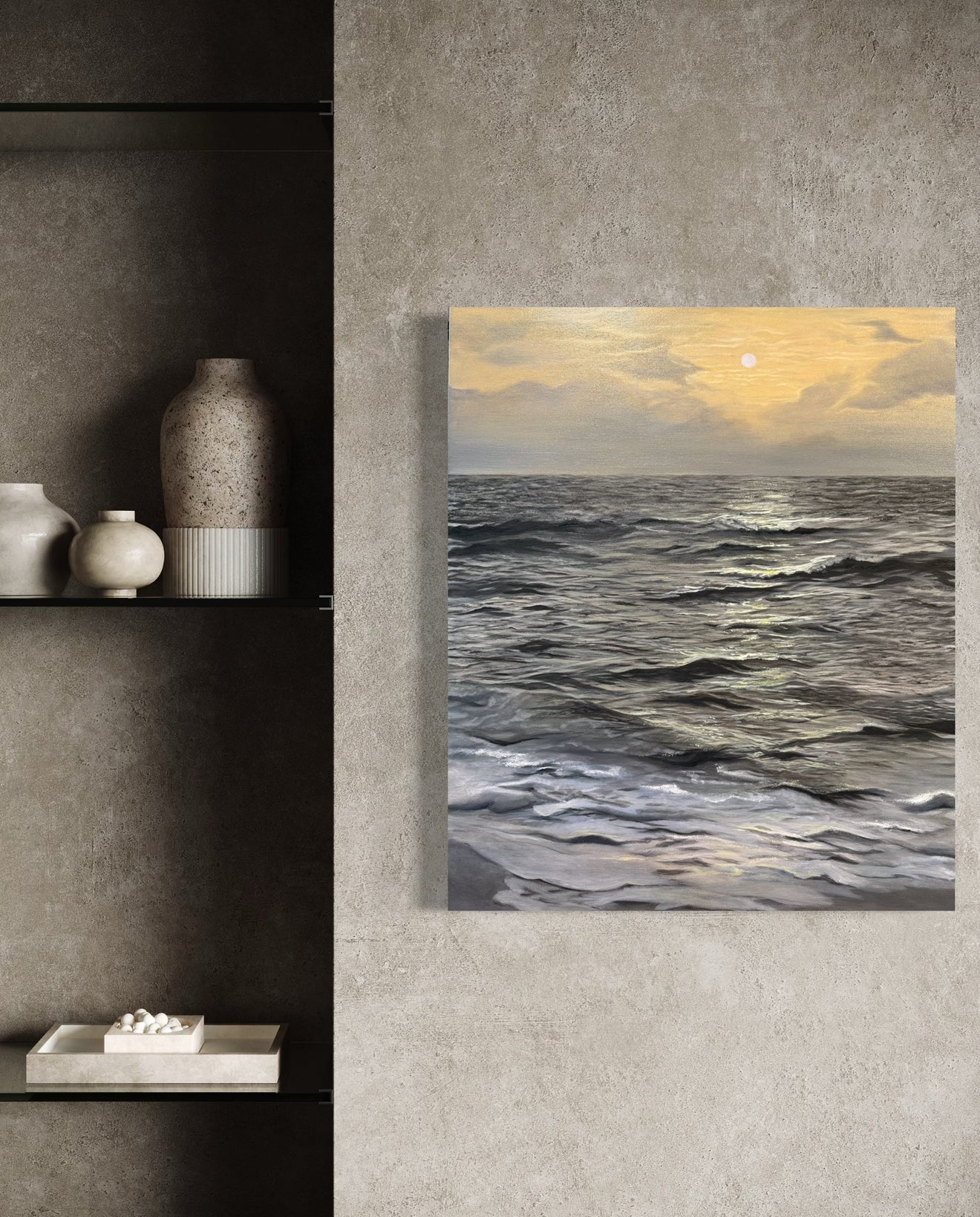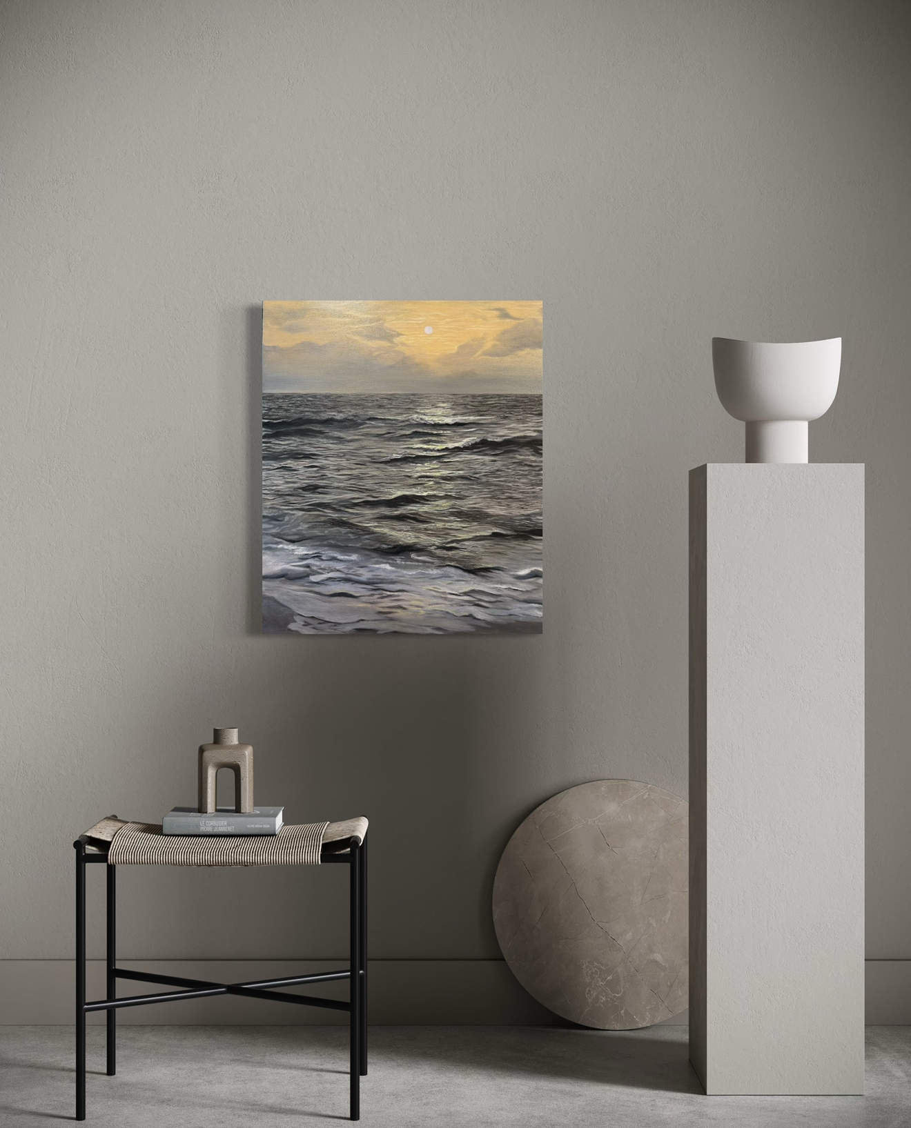 "Begin" is an original oil painting measuring 20 by 24 inches that beautifully captures a peaceful sea coast with calm waters. This artwork brings a sense of tranquility and calmness to any room, making it an ideal choice for creating a relaxing atmosphere in your home or office. Add a touch of serene coastal charm with this timeless piece that invites you to pause and unwind.