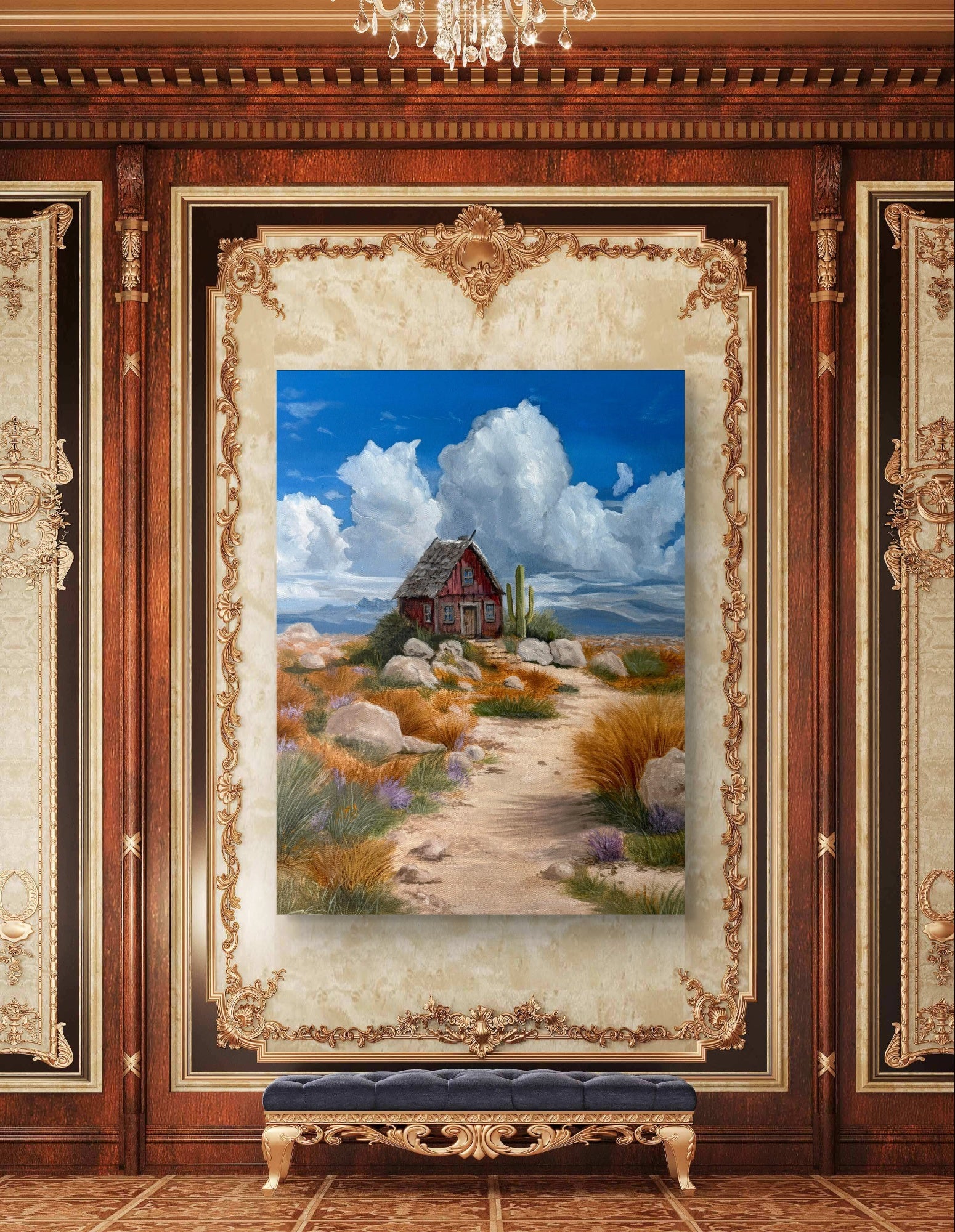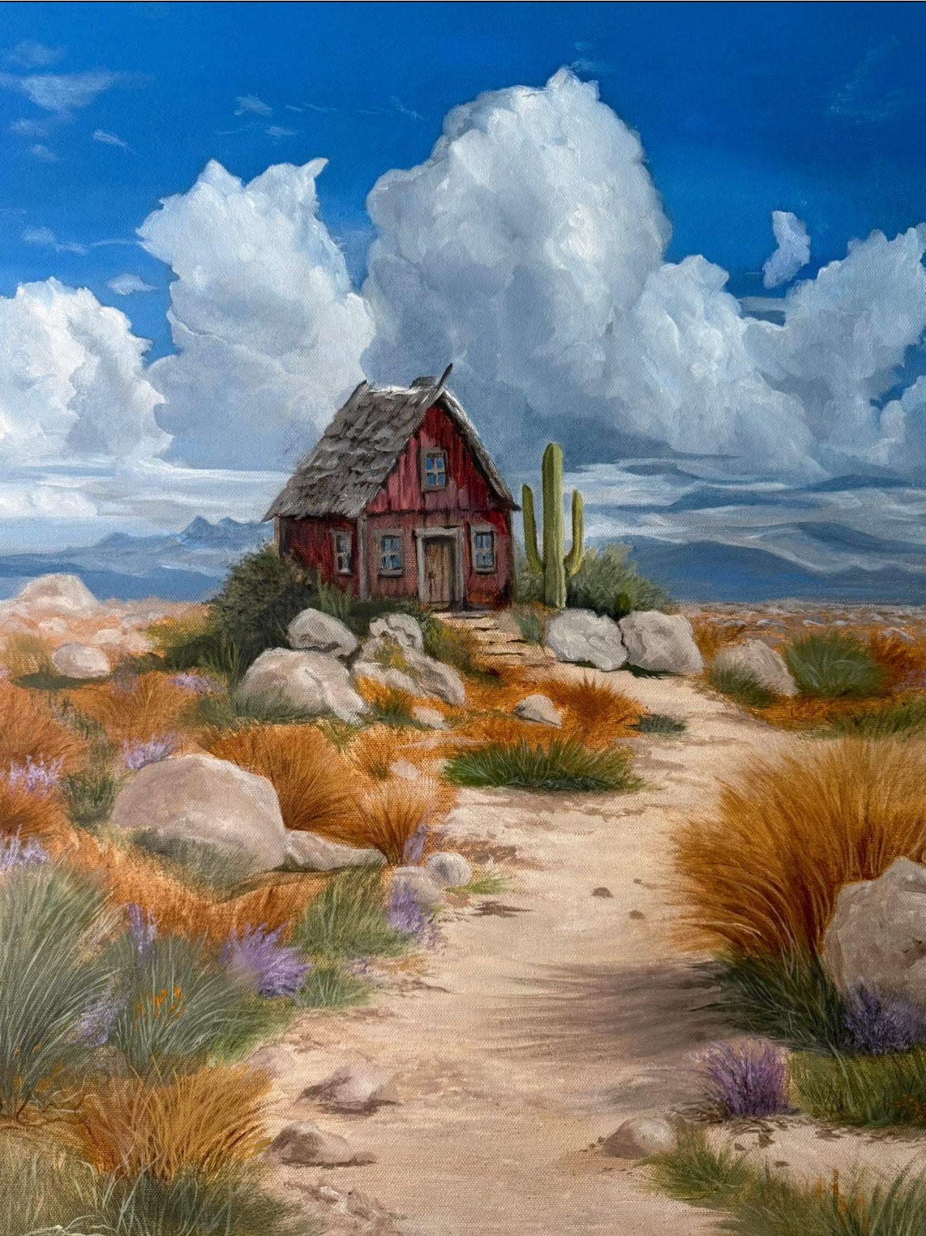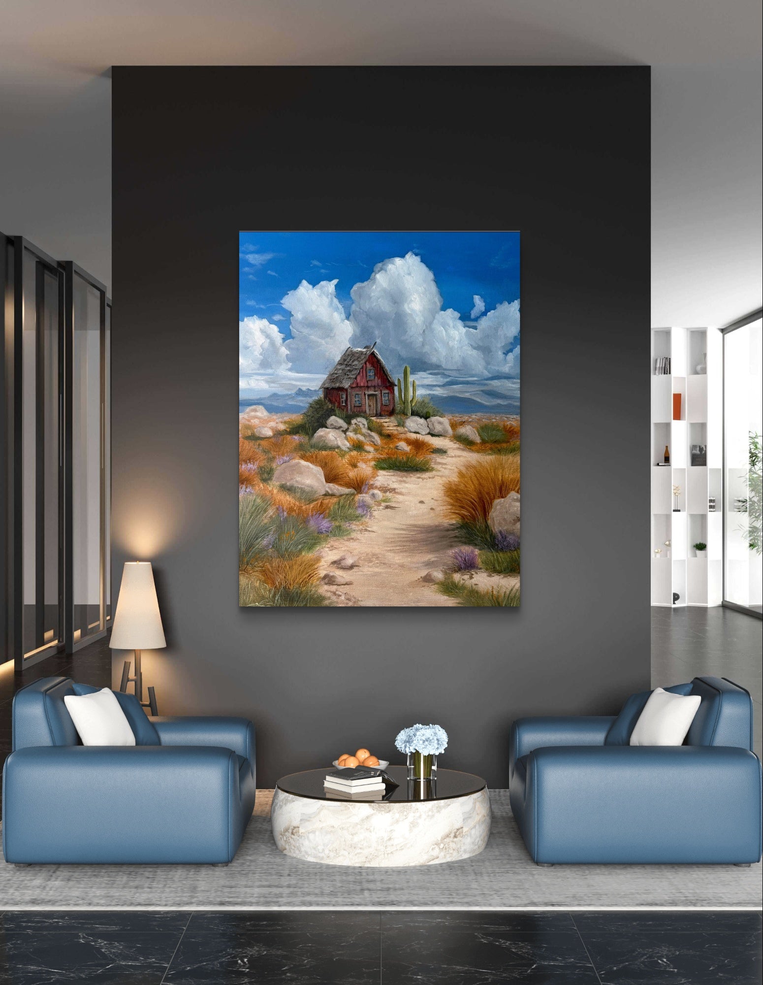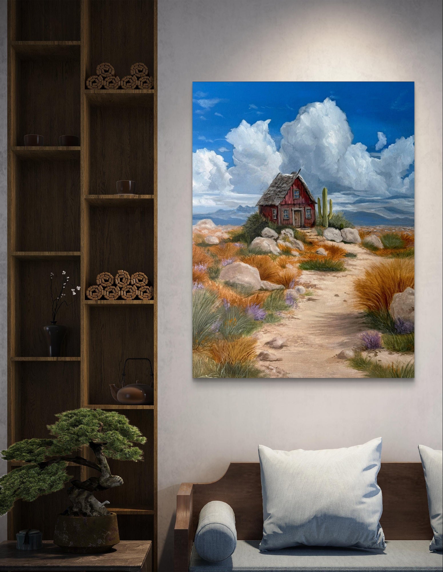 Immerse yourself in tranquility with "Deep Inside," a captivating 20x24 inch original oil painting. This piece warmly captures a cozy cabin nestled among soft clouds and textured stones, evoking a serene retreat from everyday life. Perfect for adding a touch of calm and inviting vibes to your living space, it transforms any room into a peaceful haven. Experience the harmony of nature and comfort through this unique artwork.