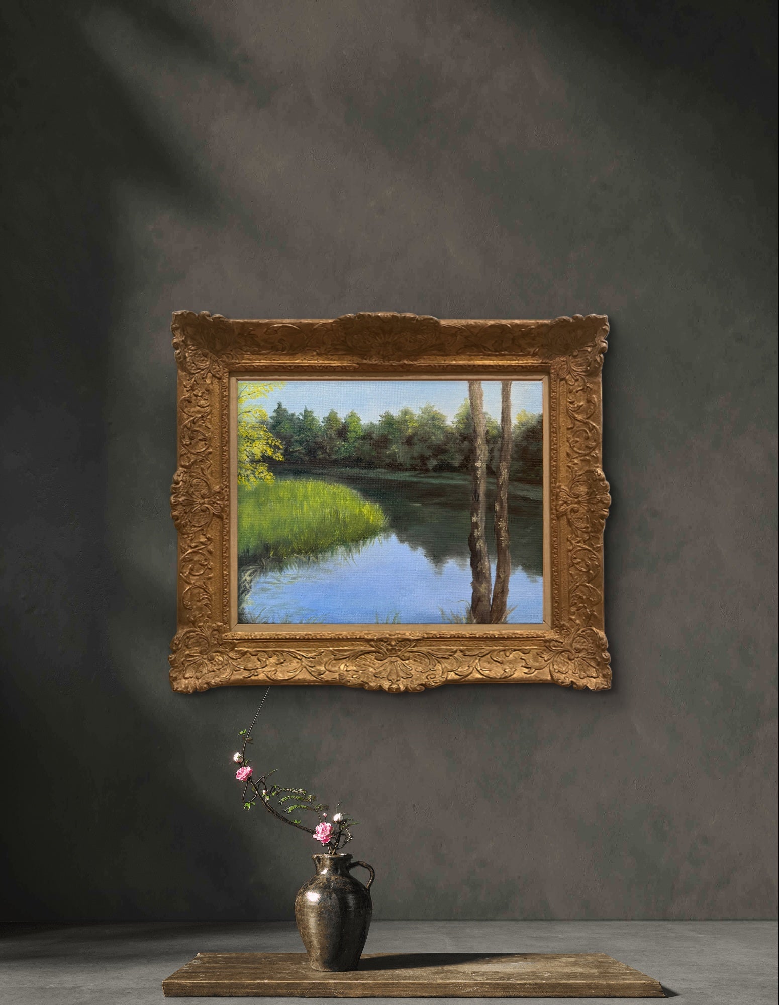 Experience tranquility with "Lakeview Serenity," an original 11x14 inch oil painting capturing the peaceful charm of a lake surrounded by trees. This nature landscape invites calm and a soothing atmosphere into any space, perfect for creating a serene environment in your home or office. Its rich textures and vibrant colors bring the beauty of the outdoors inside, making it a timeless addition to your art collection.