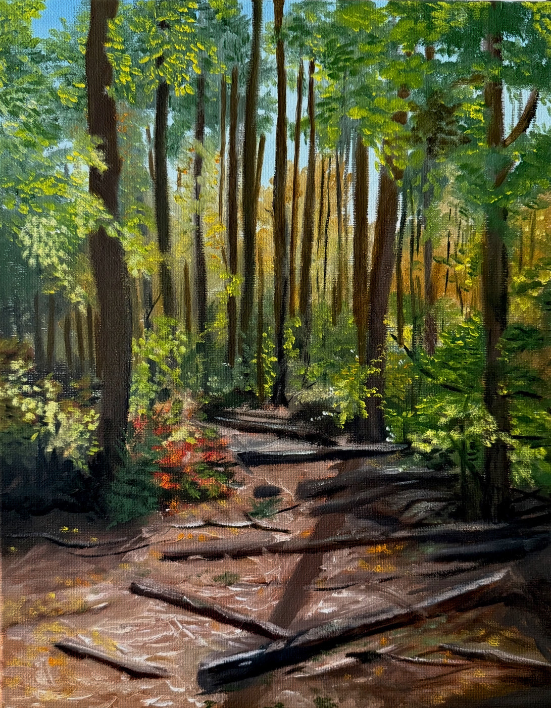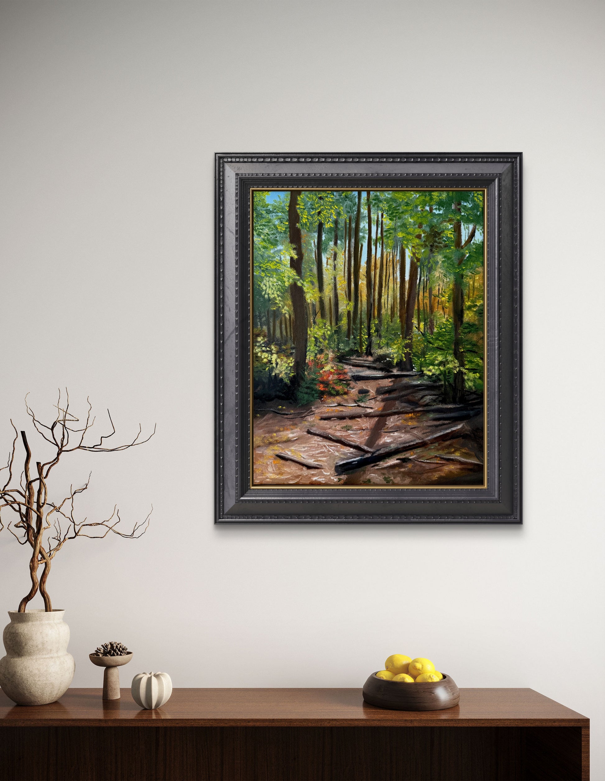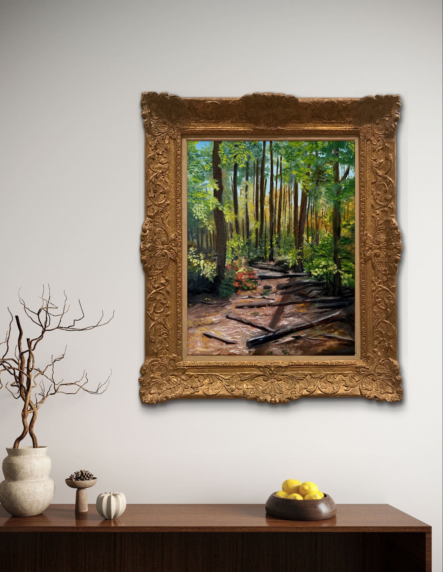 This 11x14 inch original oil painting, "Remember," captures the warm stillness of a peaceful day in the forest. Its rich colors and serene atmosphere bring a touch of natural magic into any space, making it a perfect choice to inspire calm and connection with nature in your home or office.